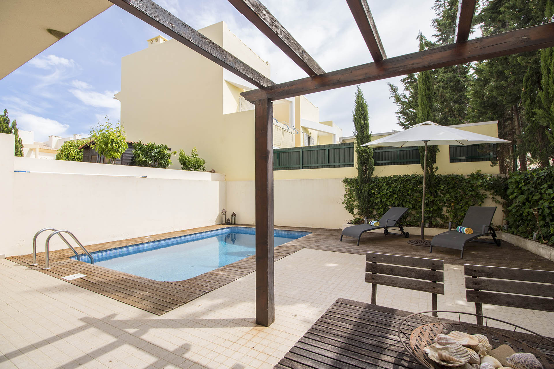 Situada num local habitacional tranquilo, perto de Almancil, de Loulé e a apenas 10 minutos das praias, esta moradia de 3 quartos conta com uma piscina privada, um espaço de exterior bastante acolhedor e uma sala de jogos com bar ao nível da piscina. Ótimo para passar umas tardes agradáveis com os seus familiares e amigos.