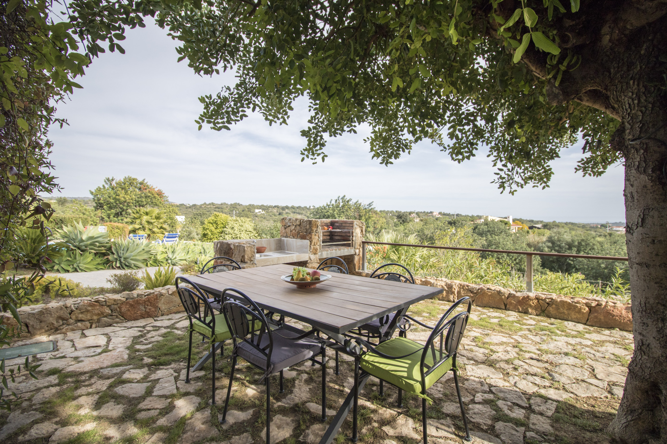 The charcoal barbecue is conveniently placed near the outdoor dining table, together with the rest of the outdoor furniture.