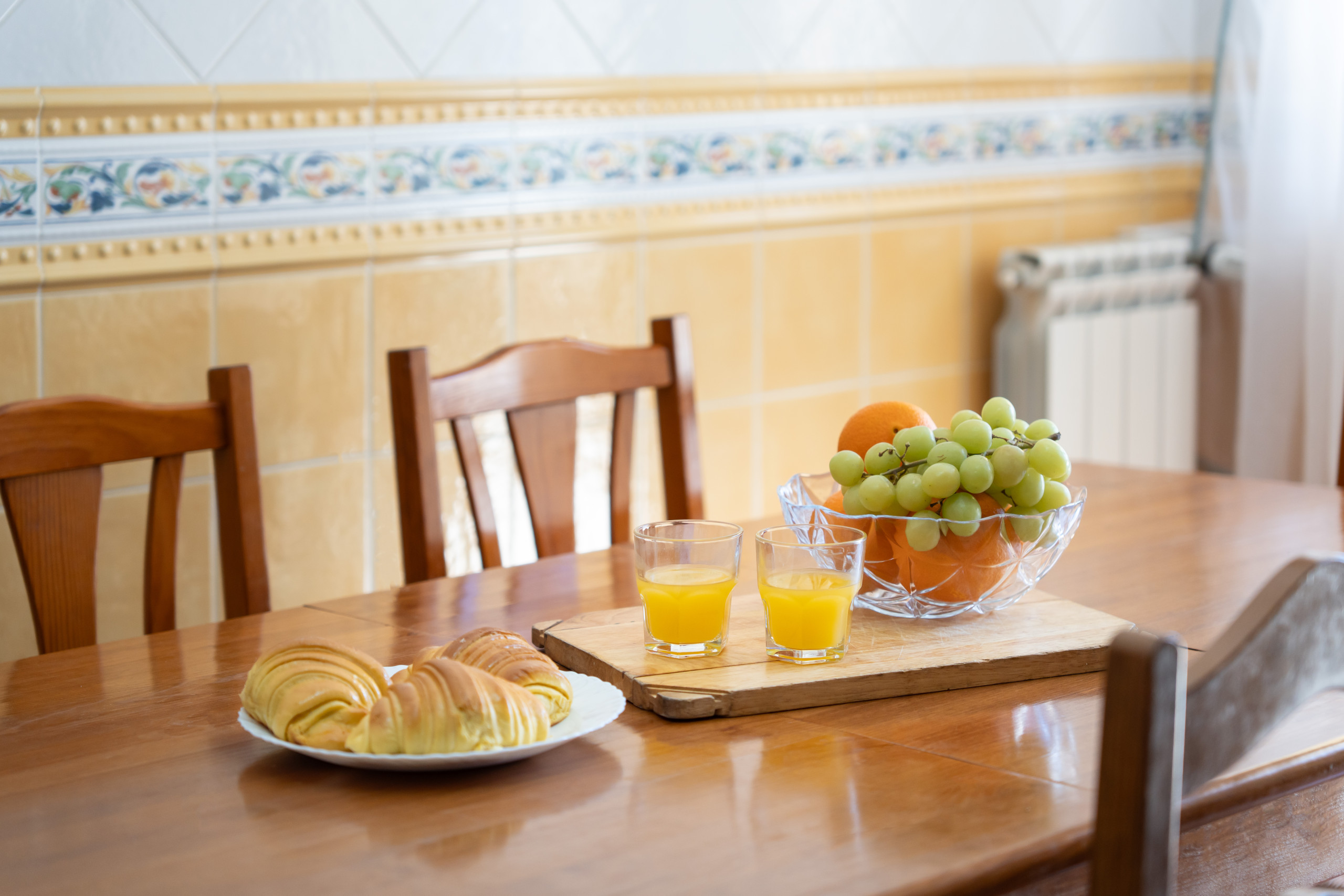 Mineral water, fresh fruit (seasonal fruit + bananas + oranges + apples), fresh bread for every guest, orange juice, butter, cheese, ham.