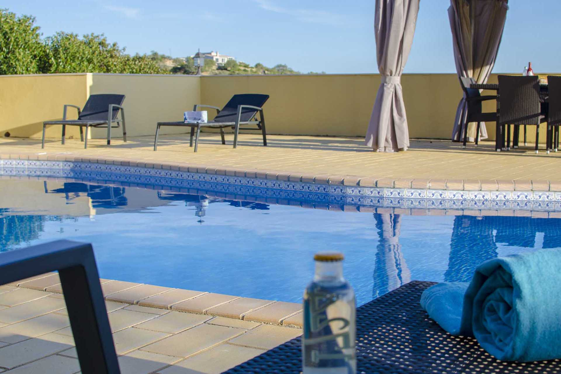 The highlight of this beautiful villa is without a doubt the view, it is difficult to remain indifferent to the sight of the sea, the islands and the Ria Formosa. A pergola covers the outdoor table which can sit 10 people contemplating the frameless picture while enjoying a meal. Next to it, a comfortable sofa, supported by a glass-topped table for light meals or tea, games or reading. With sunshine all day long, the sun loungers along the pool are the delight of our guests.